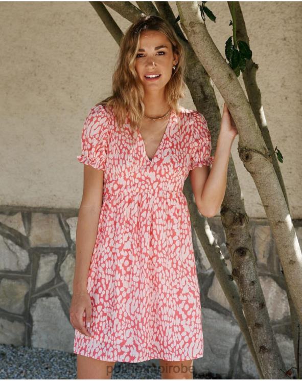 Robe courte avec imprimé motes sur fond saumon. encolure avant en pointe. manches courtes légèrement bouffantes. coupé sous la poitrine et la taille. jupe courte et droite avec doublure. une robe confortable et parfaite pour les projets de jour ou de week-end.